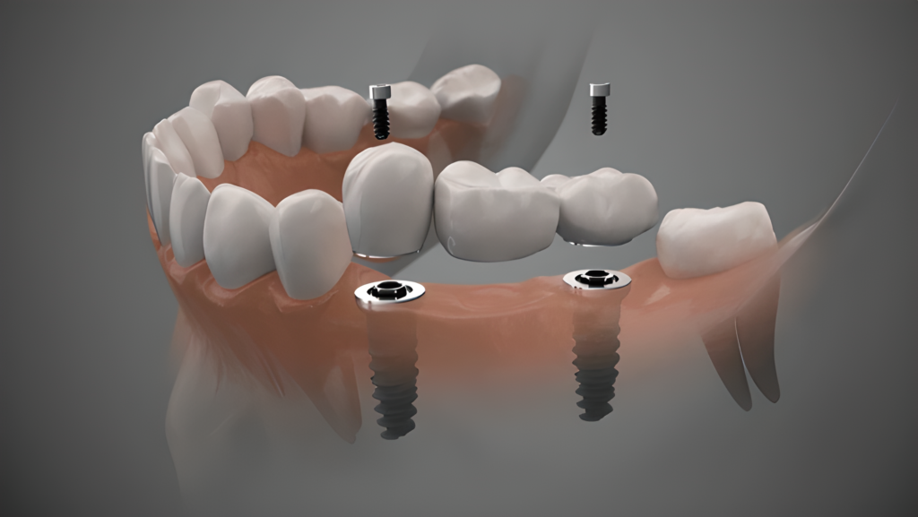 Les quatre implants dentaires peuvent soutenir une prothèse fixée avec entre 12 et 14 dents. Une prothèse transitoire est placée immédiatement le jour même de la chirurgie.
