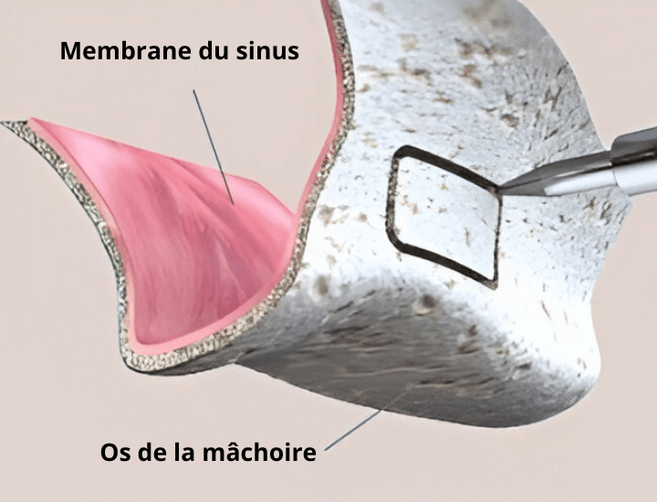 Cette approche corrige les défauts osseux au niveau des sinus et dans les secteurs postérieurs supérieurs, appelée greffe de sinus ou sinus lift. Si la hauteur osseuse sous le sinus est entre 3 et 6 mm, les implants peuvent être posés le même jour pour réduire les interventions.