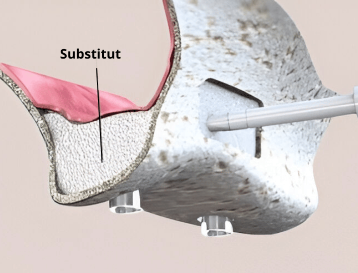 Le défaut osseux est comblé avec divers biomatériaux synthétiques, traités pour garantir une sécurité élevée. Le greffon est placé dans la zone concernée et immobilisé par une membrane. Ce procédé peut être combiné avec la pose simultanée ou différée des implants. Une cicatrisation de 4 à 9 mois est nécessaire pour une consolidation optimale.